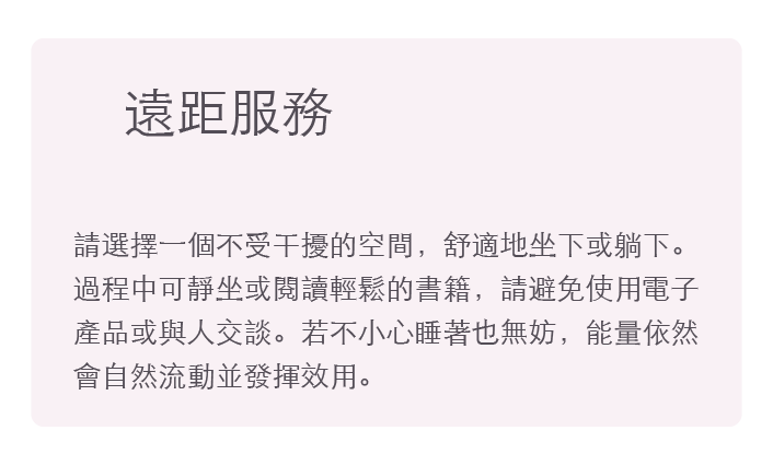 因當您預約的那一刻開始,療癒師的能量流就已經在為這次的療癒開始運作,初步的能量療癒已經於無形中在進行著,故請您確定預約此服務再報名,並請尊重我們的預約退款延期辦法。